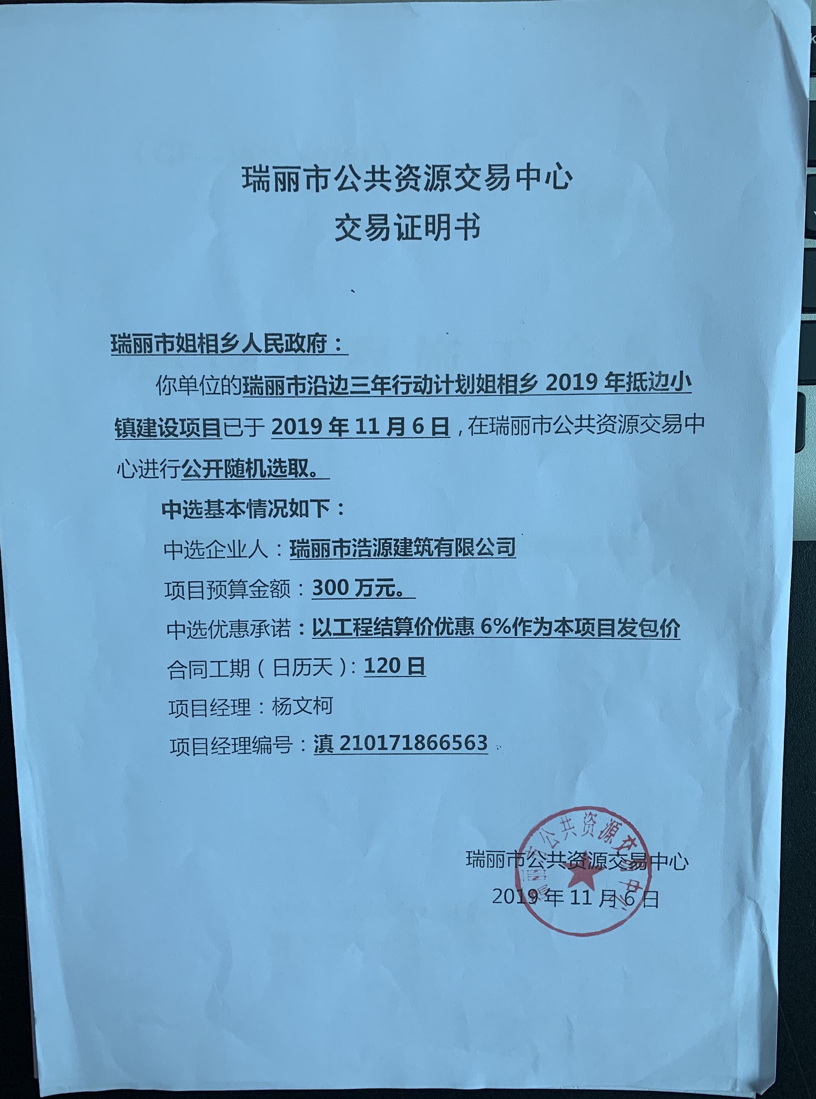 姐相乡2019年度抵边小城镇建设项目于2019年11月6日在瑞丽市公共资源交易中心进行公开随机选取,根据《中华人民共和国政府采购法》《政府采购非招标管理办法》及有关规定,确定瑞丽市浩源建筑有限公司为项目的中标企业。
