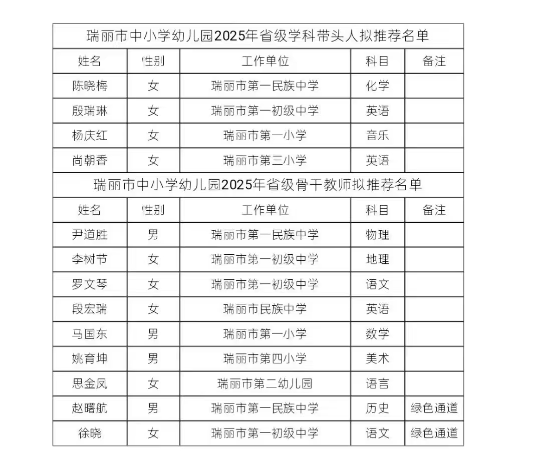 按照《云南省教育厅办公室关于做好2025年云南省基础教育省级系列骨干教师遴选推荐工作的通知》要求,经个人申报、学校推荐、县市初审等程序,拟推荐4人报选省级学科带头人,9人报选省级骨干教师(其中赵曙航、徐晓2人为绿色通道报送)。最终评选结果以上级遴选为准。现将拟推荐名单予以公示: