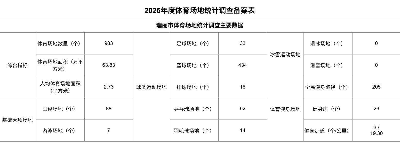 瑞丽市教育体育局根据国家统计局批准的《全国体育场地统计调查制度》(国统制[2023]131号),以2024年12月31日为标准时点,组织开展体育场地统计调查工作。现将主要情况公布如下。