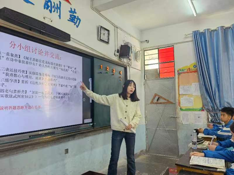 课堂伊始,龚老师通过对云南省近5年来中考古诗词曲的考察类型和分值占比的展示,让学生们对古诗考察题型有了具体化的了解。课中发挥学生主体地位,进行小组合作探究,学生们积极热烈。探究过程中总结答题技巧,分析具体题型,学生能力得到了极大的发挥。