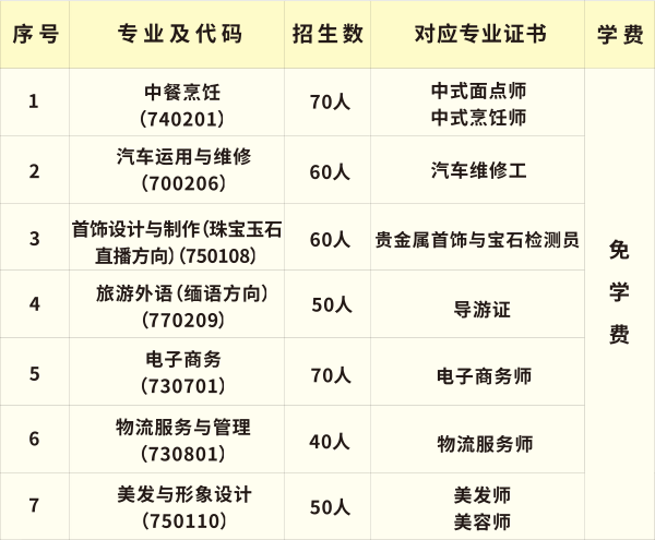 瑞丽市职业中学拥有契合市场需求的专业选择,秋季招生有中餐烹饪、汽车运用与维修、首饰设计与制作、旅游外语(缅语方向)、电子商务、物流服务与管理、美发与形象设计等7个专业,满足不同专业技术需求的学生选择。