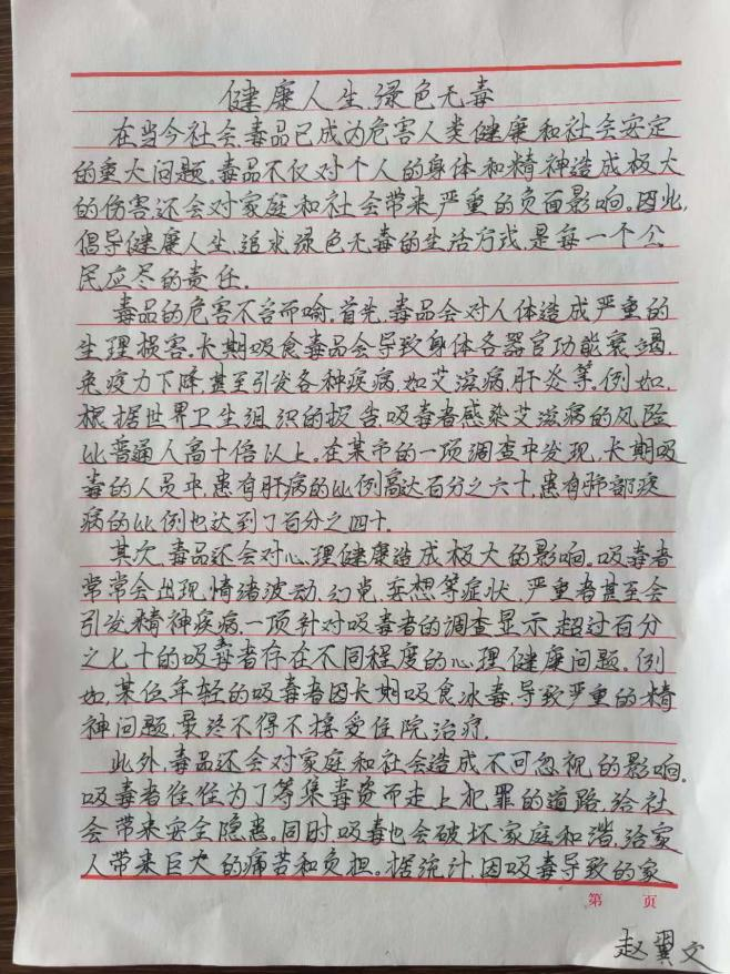 以“健康人生绿色无毒”为灵感源泉,学校广泛发动学生参与禁毒主题的作品创作,包括征文、绘画、手抄报。这项活动鼓励学生运用各种艺术形式,表达自己对毒品危害的认识和对健康生活的追求,不仅能够锻炼学生的创造能力和审美情趣,也能进一步增强其禁毒意识。