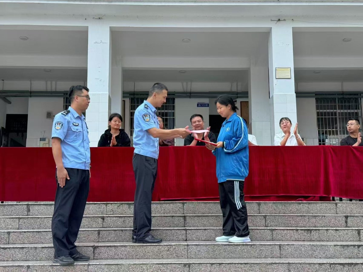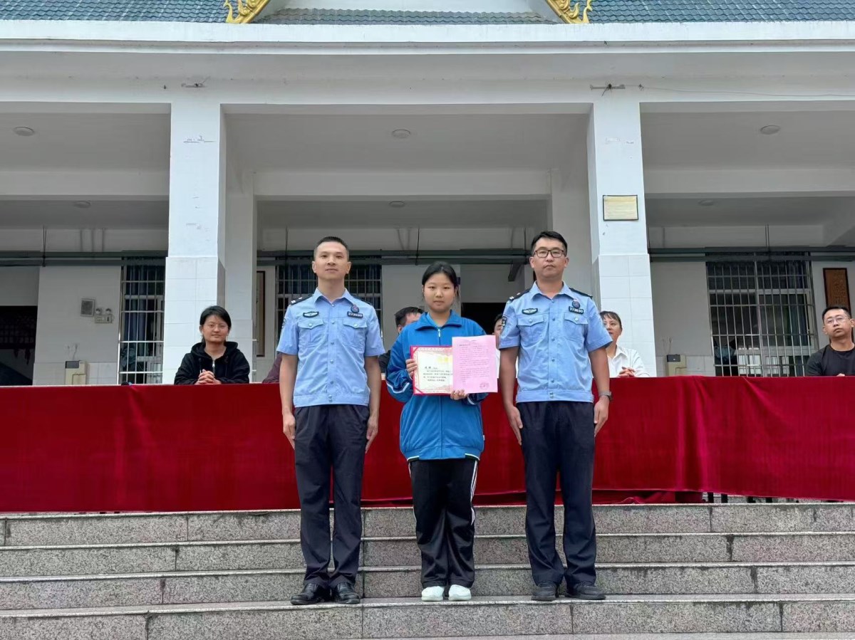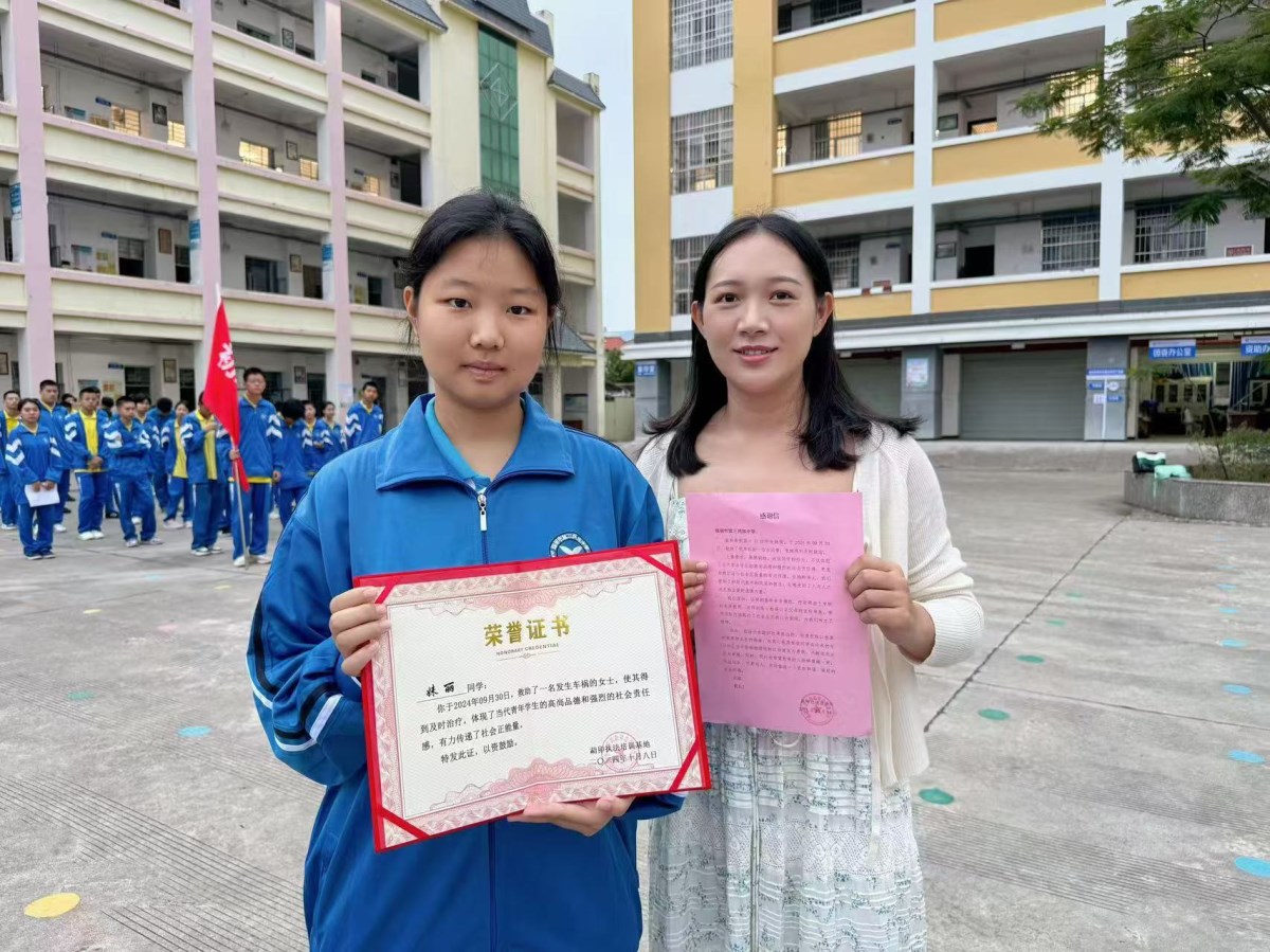 助人为乐,敢于担当是中华民族的传统美德,我校教育始终坚持落实立德树人根本任务,教育学生存善念、行善举,树立正确的人生观、价值观。2024年9月30日,我校高一年级45班同学妹丽在回家途中,路遇交通事故,一名女干警在行车道上滑倒,当时正下着大雨如不及时救助存在二次交通事故危险,面对紧急情况,妹丽同学勇于担当、竭尽全力实施了救助,并迅速拨打120、110报警,使伤者得到及时救治。被救助人单位勐卯边境派出所经多方打听找到了妹丽同学,并送来了感谢信,为妹丽颁发了荣誉证书。