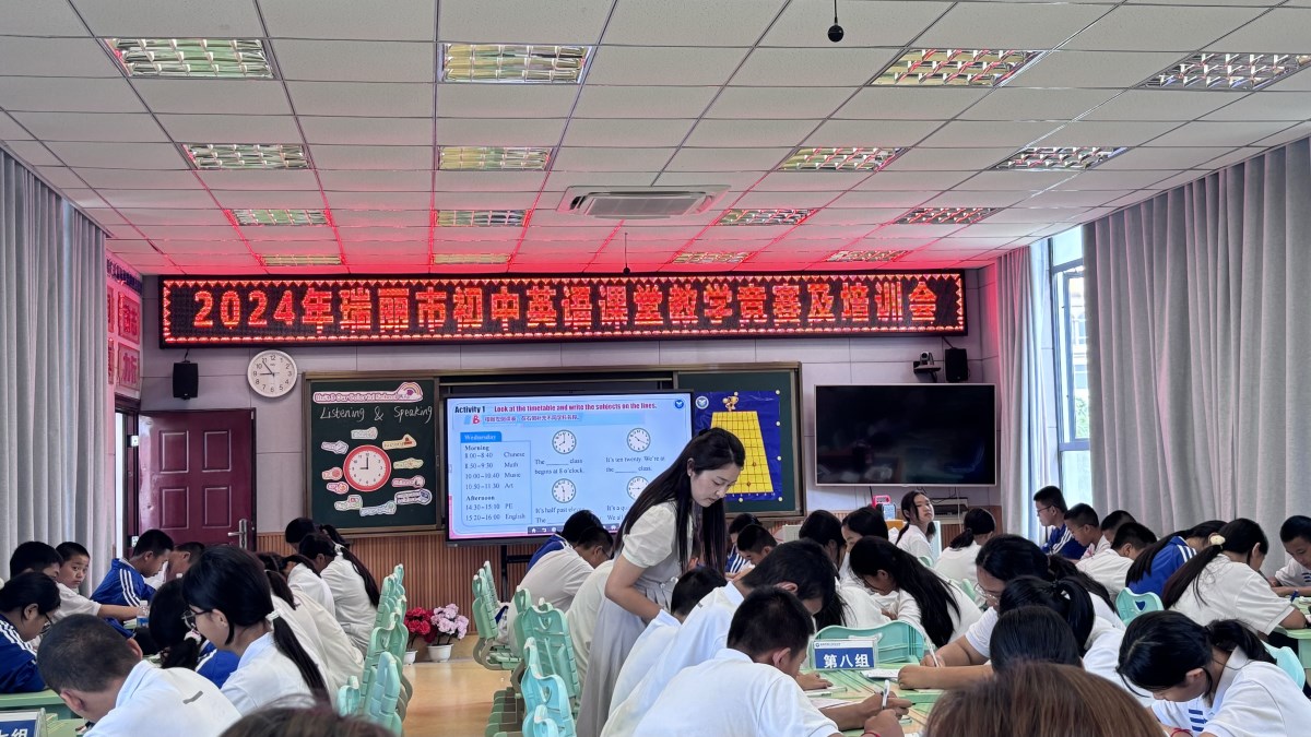 赛课前,姚婕老师认真研读新教材、教法,研磨听说课的内容,精心制作授课的课件,并由初中英语组教师团队反复打磨。在比赛当天,姚婕老师以饱满的热情、流畅的口语、扎实的学科知识和精巧的设计,尽展风采。姚婕老师先以视频导入激发学生的学习兴趣,之后按照听前,听中,听后的顺序进行教学,围绕我们丰富多彩的校园生活中的学科和课程表开展听说课。课堂环节生动有趣,以学生小记者采访同学,创造出一个积极、有趣、富有挑战性的学习环境,达到了师生互动,生生互动的效果。从词到句,从听到说,从学习新知识到听力练习,环环相扣,课堂思路清晰,逐步引导学生完成听说训练。