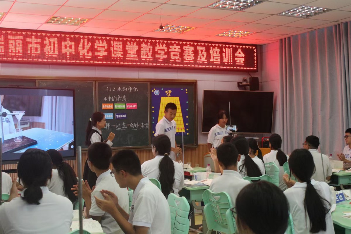 2024年10月24日和25日瑞丽市教育体育局教科中心组织初中英语与化学课堂教学竞赛。我校初中英语学科长姚婕和初中化学学科长杨翟引两位老师参赛。
