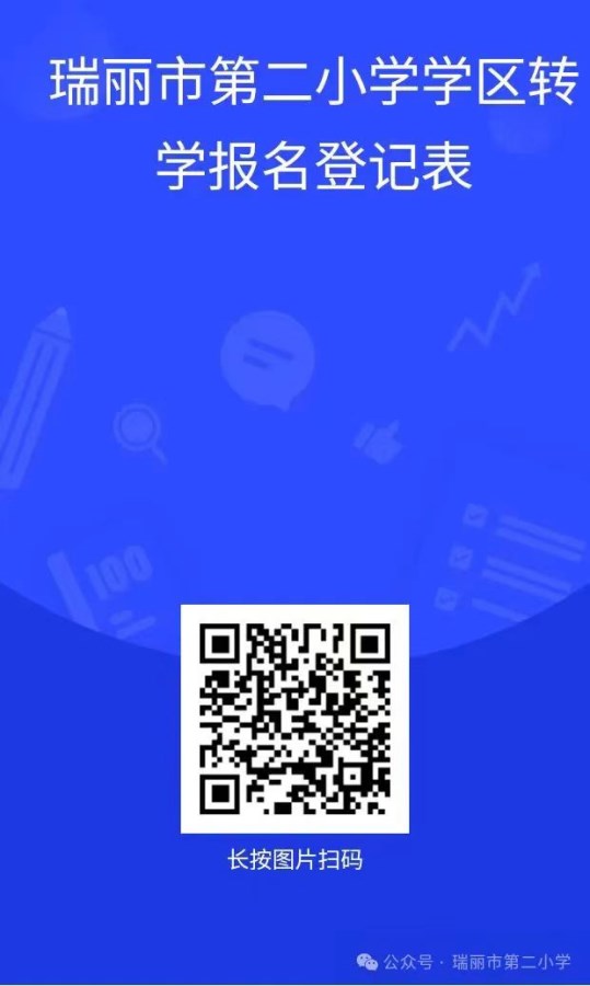 第一步:自此通告发布后,请转入学生监护人进入“瑞丽市第二小学”公众号,并在规定报名时间内进行线上报名(扫码进入,如实填写相关信息)。报名时间过后,系统将关闭,届时不再受理报名事宜。