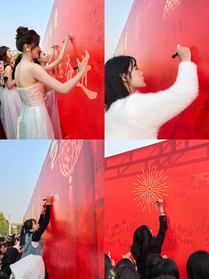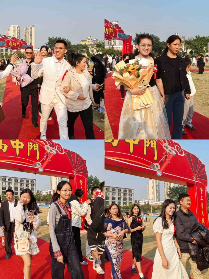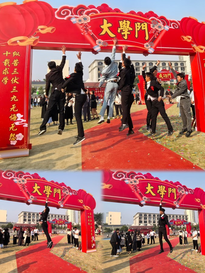 最后,家长和学生一起携手走过成功门、高中门、大学门。他们分别在相应的签名墙上签字并合影留念,留下了这一美好而难忘的时刻。两三教师队伍分别站在成功门前红毯两边,为学生们加油打气,场面热烈而鼓舞人心。