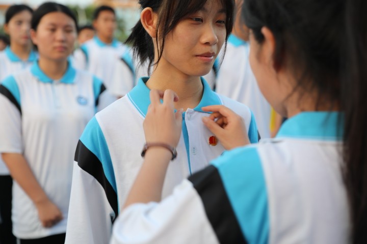 在颁发团徽环节,老团员们郑重地为新团员佩戴上团徽。一枚枚闪耀的团徽,不仅是一种荣誉的象征,更是一份责任的传承。佩戴好团徽后,在瑞丽市第三民族中学团委副书记张杰梅老师的带领下,新团员们面向团旗,庄严宣誓。他们高举右拳,声音洪亮,表达了对共青团组织的忠诚与为共产主义事业奋斗的决心。