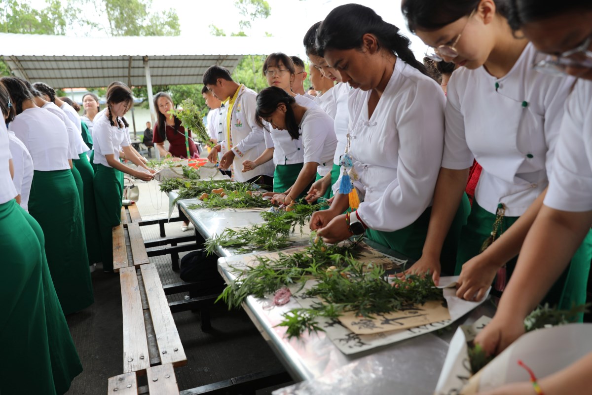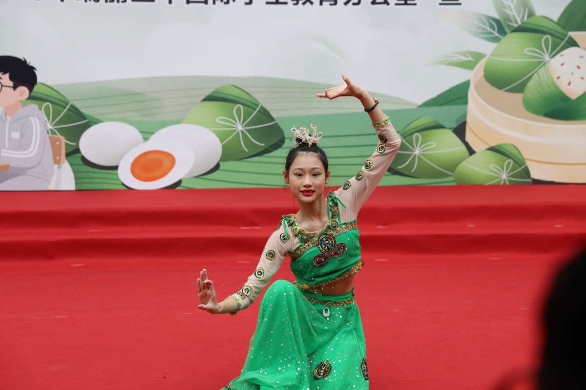 艺术是文化最生动的表达。国际学生带来的舞蹈《美美与共》,缅甸筒裙出场,音乐响起,台下领导、观众都兴奋地手舞足蹈地跟随音乐摇摆,以多元文化交融的独特魅力赢得阵阵掌声;八年级学生罗瑞冰表演的孔雀舞,将传统非遗技艺展现得淋漓尽致。随后的端午节知识竞答环节更是热闹——国际学子回答道:“我知道!雄黄酒是给白娘子喝的!”童言童语逗得全场大笑,有些国际学子获得的香囊,塞进老师口袋:“驱蚊的,送给您!”台上台下的热烈互动,让文化传承在欢声笑语中自然流淌。端午安康,当然少不了送祝福,互相赠送五色彩绳,一根丝线编织出五行学说的深邃哲理。