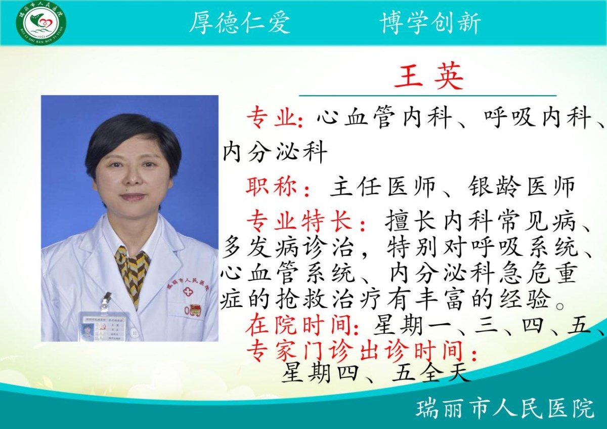 为全面贯彻落实云南省“银龄医师”行动计划,拓宽引智渠道、优化服务链条、让人才引得进,发挥“传、帮、带”作用,弘扬“银发力量”扮靓彩云之南,使有需求的患者不用出远门,可以继续在瑞丽市人民医院便可享受专家级的优质医疗服务,同时减轻患者医疗费用负担,我院(原院长)退休内科主任医师王英2025年5月6日正式签约瑞丽市紧密型医共体“银铃医师”,常驻瑞丽市人民医院在专家门诊坐诊,欢迎有需求的朋友们前来预约就诊。