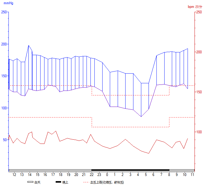 3、最高血压值、最低血压值:找出血压高峰和低谷的时间,结合患者的生活状态及症状寻找其原因,协助诊治继发性高血压及评估靶器官情况,并制定降压方案。