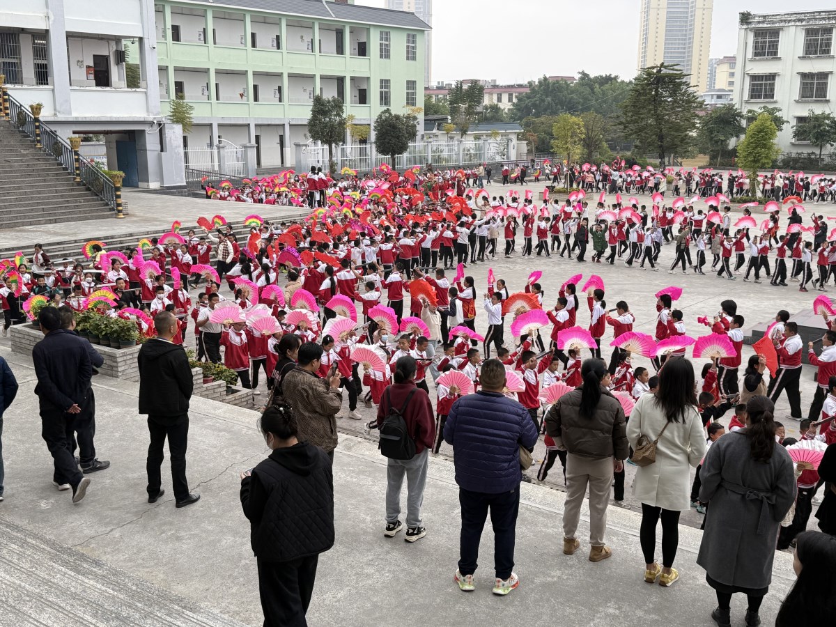 课间操铃声响起,民族小学的特色课间操准时拉开帷幕!家长们驻足观赏,全校师生共舞景颇族经典的目瑙纵歌。孩子们精神抖擞,男生手持景颇刀,女生挥动五彩的扇子,踏着整齐划一的步伐,跟着欢快激昂的音乐尽情律动。