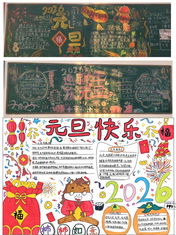 “欢庆元旦”主题黑板报、手抄报评比活动,是校园文化建设的重要抓手,也是班级凝聚力展示的重要平台。各班师生群策群力,将新年愿景、民族团结故事、校园发展成就、时代奋进精神等元素融入创作之中。黑板上,色彩斑斓的图案勾勒出对新年的憧憬;手抄报里,工整优美的文字书写着青春的誓言。有的班级聚焦民族文化特色,以傣族剪纸、景颇织锦等元素装点版面;有的班级紧扣时代脉搏,将航天精神、亚运风采等内容融入设计。这些作品不仅是创意与才华的展示,更是学校五育并举育人成效的生动缩影。活动以文化阵地建设为契机,营造了昂扬向上、温馨和谐的节日氛围,构建起全员参与、全域覆盖的校园育人新格局。