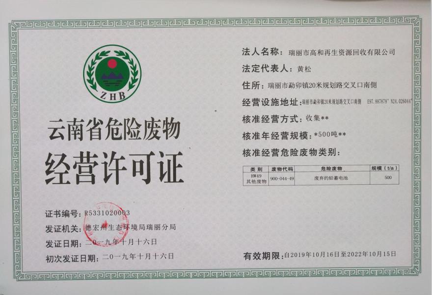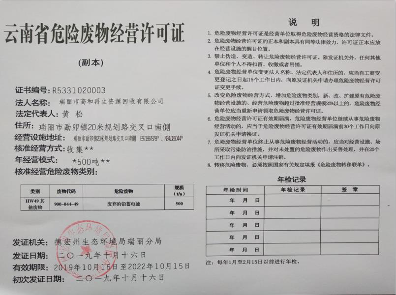 云南省危险废物经营许可证公开(瑞丽市高和再生资源回收有限公司)