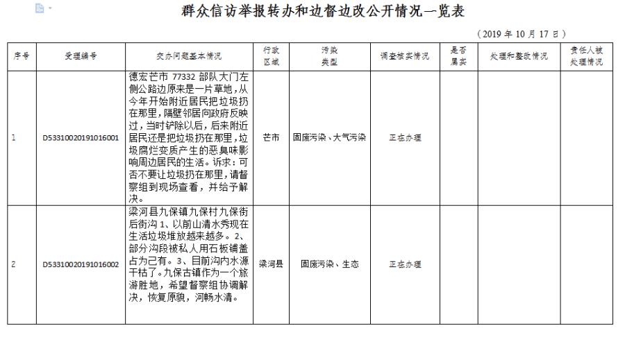 20191015-16日,德宏州共接收省委、省政府第四生态环境保护督察组转办环境问题举报件2件,涉及芒市1件,梁河县1件。交办的举报件涉及固废污染2件。