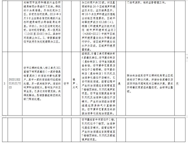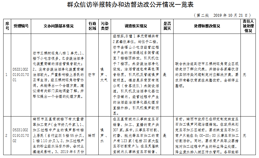 2019年10月15-21日,德宏州共接收省委、省政府第四生态环境保护督察组六批次转办环境问题举报件32件(来电举报问题25件,来信举报问题7件),涉及全州共性问题1件,芒市19件、瑞丽市4件、盈江县4件、梁河县2件、陇川县2件。交办的举报件涉及固废污染5件、噪声污染9件、大气污染9件、水污染2件、其它问题7件(部分举报件含多项污染类型)。