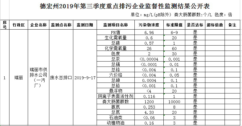 德宏州2019年第三季度重点排污企业监督性监测结果公开表