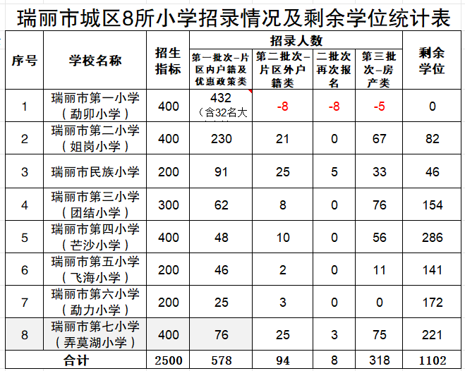 根据《瑞丽市人民政府办公室关于印发瑞丽市2024年城区中小学幼儿园招生工作等实施方案的通知》,8月7日城区7所小学同时进行第二批次招录,现将具体学校招录情况和剩余学位公布如下: