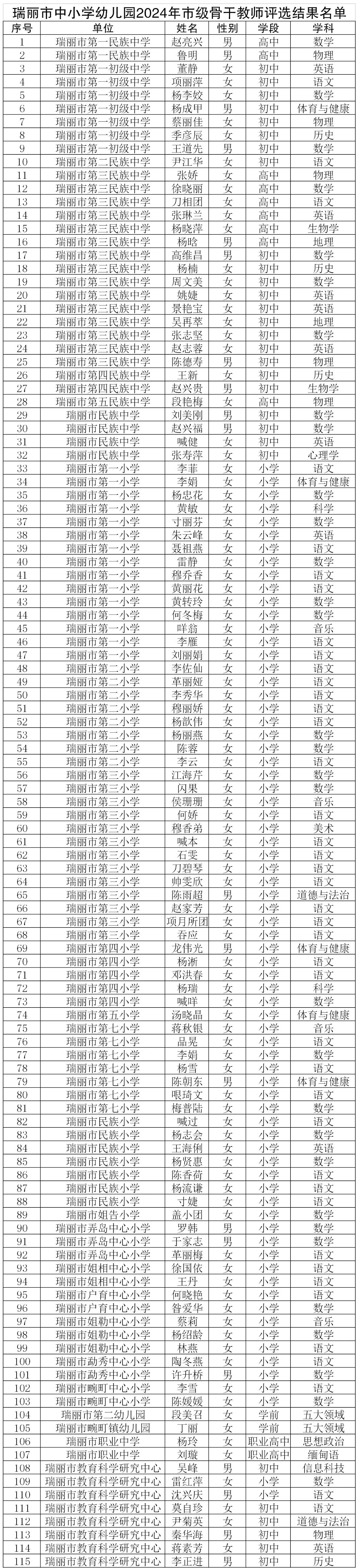 根据《云南省教育厅关于基础教育三级三类骨干教师队伍建设计划的实施意见》,省、州、市《高质量发展三年行动计划》及“优质均衡”相关评估指标的要求,瑞丽市教育科学研究中心坚持师德为先、自下而上、逐级审核、推荐上报的原则,在2023年已认定市级学科带头人63人,骨干教师302人的基础上,2024年继续遴选出赵亮兴等115名同志为市级骨干教师,名单如下: