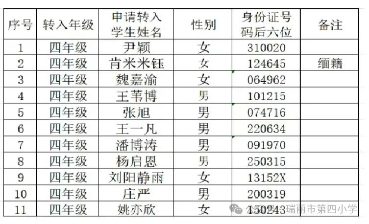 根据瑞政办[2021]25号《瑞丽市城区中小学转学管理规定(试行)》、瑞丽市教育体育局便签(2025)18号工作提醒文件精神,现将2025年春季学期同意转入瑞丽市第四小学四年级的学生信息公告如下: