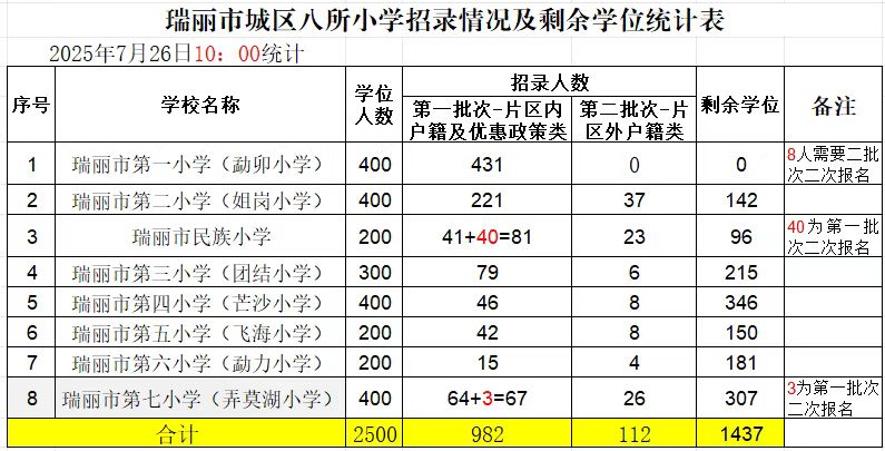 根据《瑞丽市人民政府办公室关于印发瑞丽市2025年城区中小学幼儿园招生工作实施方案的通知》,7月26日城区八所小学同时进行第二批次招录,城区四所初中7月25日同时进行第一至四批次招录,现将具体学校招录情况和剩余学位公布如下: