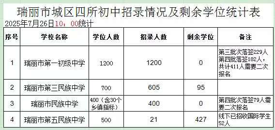 瑞丽市第三民族中学和瑞丽市第五民族中学按招生录取流程一次性将第一批次至第四批次审核通过的学生在招生计划学位数内全部直接录取(瑞丽市第五民族中学招录的1名学生今天回原籍就读,招录人数变更为21人)。瑞丽市第一初级中学已录取完计划学位数,请第三批次落签学生229人和第四批次182人共计411人在2025年7月26日18时至7月27日10时登录“瑞丽市教育体育局”微信公众号对应菜单,进行二次报名。瑞丽市民族中学已录取完计划学位数,请第四批次落签学生79人在2025年7月26日18时至7月27日10时登录“瑞丽市教育体育局”微信公众号对应菜单,进行二次报名。可选学校为有空余学位的瑞丽市第三民族中学和瑞丽市第五民族中学。如瑞丽市第三民族中学二次报名人数超出剩余学位数,计划将于2025年7月27日15点进行随机派位,如少于剩余学位数则全部录取。提示:截至2025年7月26日12时,瑞丽市第一初级中学和瑞丽市民族中学的落签学生暨第四批次学生数共计490人,瑞丽三中空余学位95个,瑞丽五中空余学位427个,共计空余学位522个。