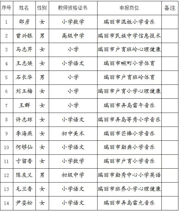 根据《云南省教育厅办公室关于做好2025年秋季学期基础教育银龄教师招募工作的通知》《瑞丽市教育体育局2025年秋季学期基础教育银龄教师招募实施方案》要求,为充分利用退休教师优势资源,进一步提高基础教育质量,现就瑞丽市教育体育局2025年秋季学期基础教育银龄教师招募拟聘人员公示如下: