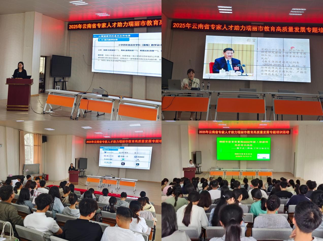 为做好云南省2025年专家人才服务基层项目——“弘扬爱国奋斗精神 建功立业新时代”活动,提升基层教育科研水平与教学实践能力,2025年10月20日—23日,云南省“专家服务基层示范团”到瑞丽开展为期三天服务活动。本次活动覆盖全市基层教师、教育管理者共计710人,通过精准的知识输送与专业的实践指导,为瑞丽市基础教育高质量发展注入新动能。