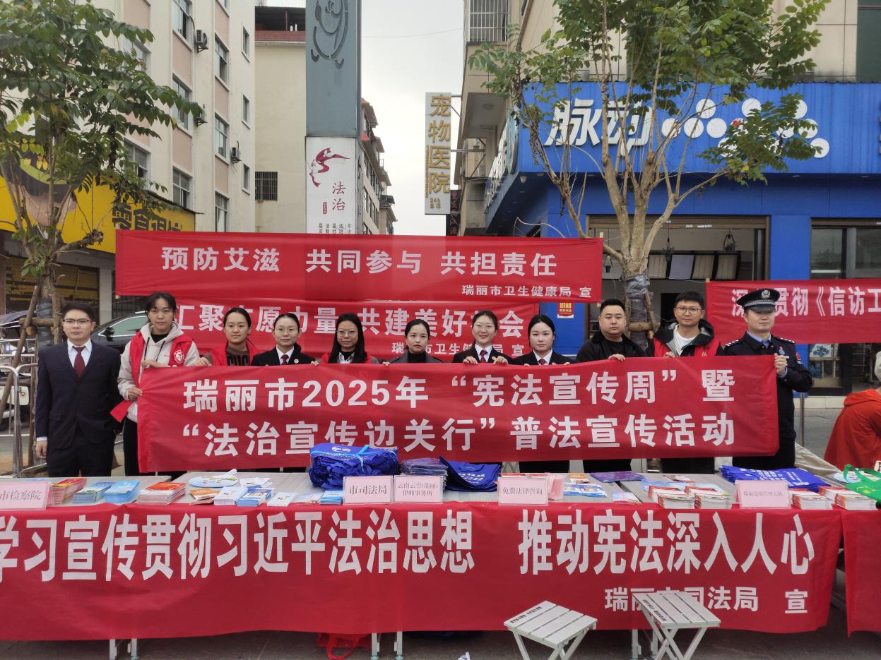为深入学习贯彻习近平法治思想,大力弘扬宪法精神,普及宪法观念,2025年12月1日,市司法局联合市委宣传部、市检察院、市法院、瑞丽边境管理大队、市卫健局、市应急管理局、市工会等18家单位,在弄莫湖开展以“学习宣传贯彻习近平法治思想,推动宪法深入人心”为主题的“宪法宣传周”暨“法治宣传边关行”普法宣传活动。