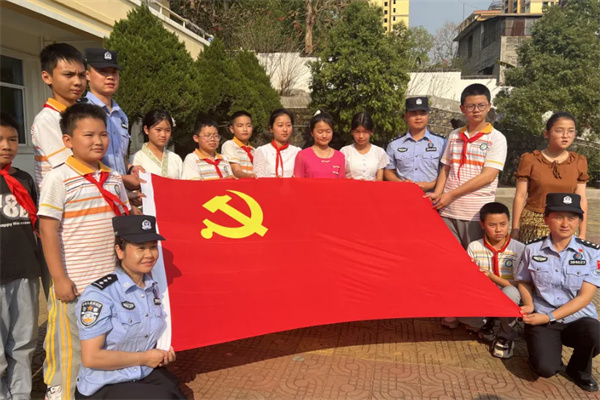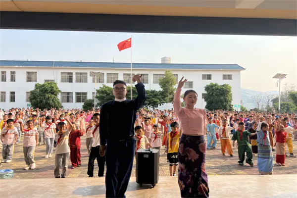 畹町出入境边防检查站执勤队参与畹町小学非物质文化遗产传承活动,为小学生普及泼水节期间的安全注意事项。