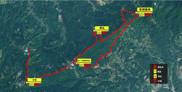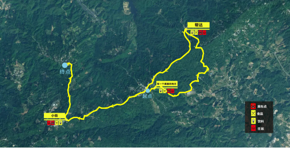 有一个美丽的地方(起点)—六队岔口土路(左转)—植物园大门口—G556国道—瓦姐坝寨门口(左转上山)—邦达山寨—有一个美丽的地方起点—小街—户瓦山寨摆场(终点)