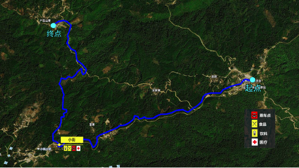 有一个美丽的地方(起点)—六队岔口土路(左转)—植物园大门口—G556国道—南京里村公路岔口左转上山—南京里村—南京里派出所、章凤老路岔口—老瑞章路干吕山村岔口—邦达山寨—有一个美丽的地方起点—小街—户瓦山寨摆场(终点)