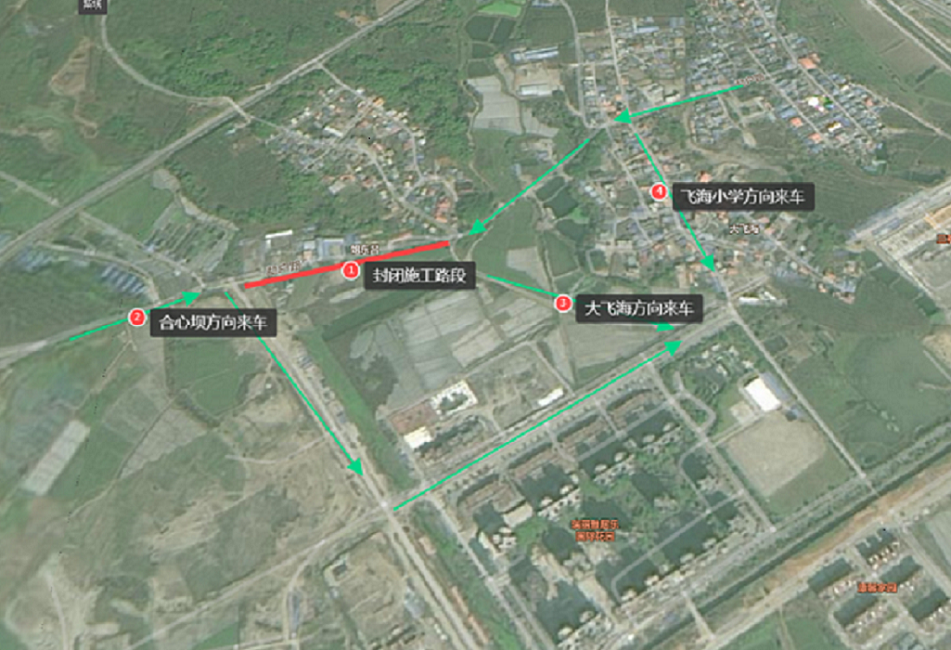该封闭路段从姐东崃村口至样样红红木家具厂为全封闭施工区域。道路封闭及交通导流示意图如下: